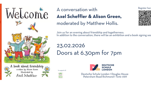 The conversation between Axel and Alison will be followed by a Q&A session, which you are warmly invited to join. We are also delighted to offer you the opportunity to view an exhibition of Axel’s original illustrations from Welcome as a special highlight of the evening.