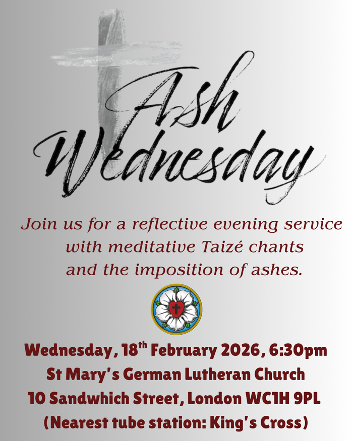 Wir laden herzlich ein zum gemeinsamen Aschermittwochsgottesdienst aller lutherischen Gemeinden in London am 18. Februar 2026 um 18:30 Uhr in St Marien, 10 Sandwich Street, WC1H 9PL. #